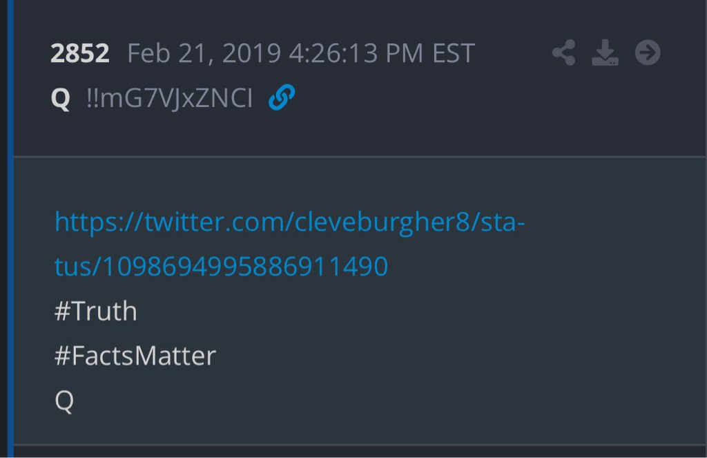 My point is that whether or not the premise is true (hint: It's not), the "coincidence" is pretty remarkable that to my research, there's only two drops out of nearly 5,000 which have #truth in them, and only one from Q. (The other was Q responding to an anon who included #truth in their post - and that one was #2879, the next day on Feb 22, 2019). Mathematically, it a fun one to consider.