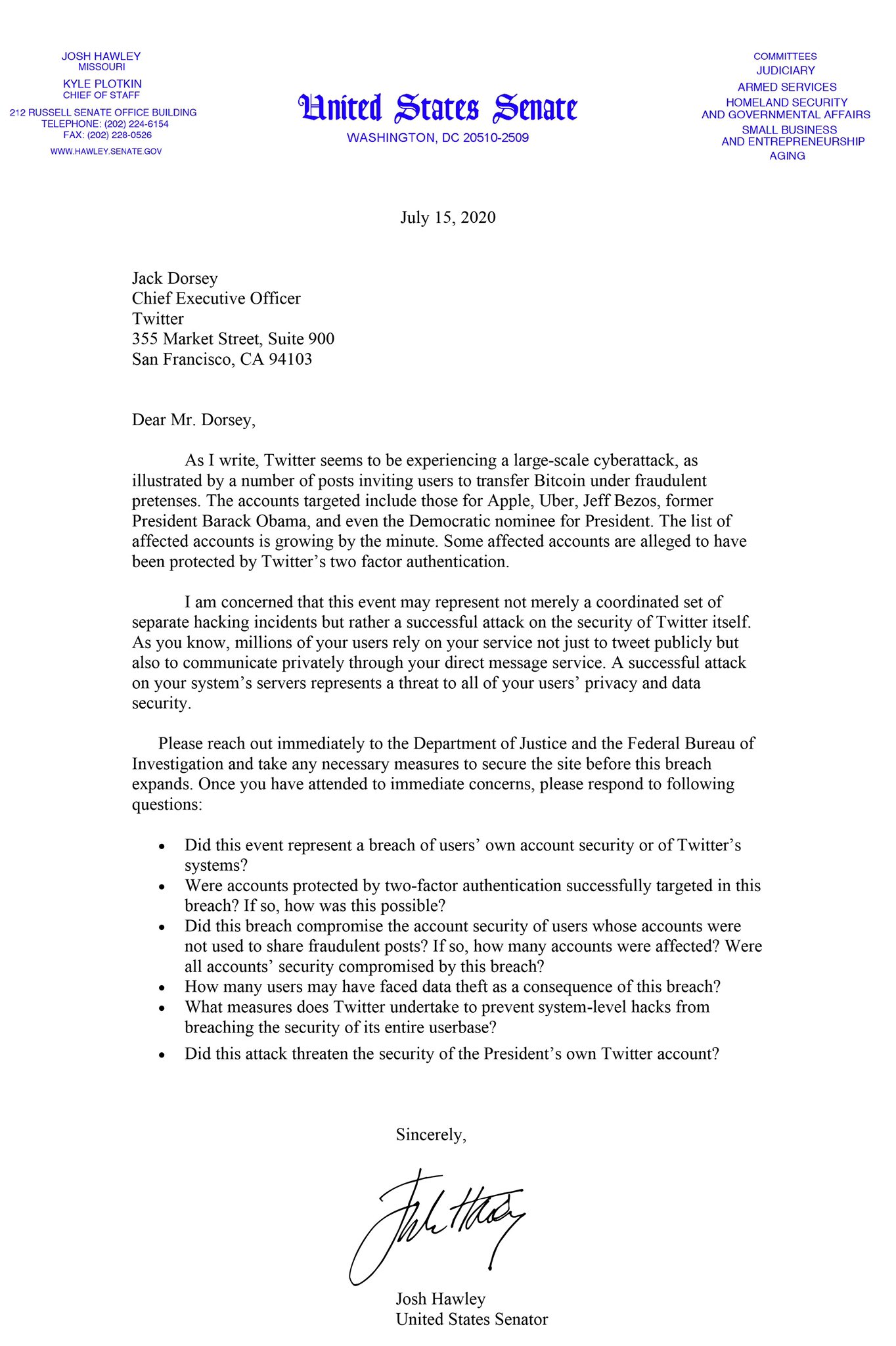 Within an hour of the breach, Republican Sen. Josh Hawley wrote a letter to Twitter CEO Jack Dorsey asking for more information about the hack, including how the hack occurred, how many users were compromised, and whether the hack affected President Trump's account. Hawley said "please reach out immediately to the Department of Justice and the Federal Bureau of Investigation and take any necessary measures to secure the site before this breach expands."