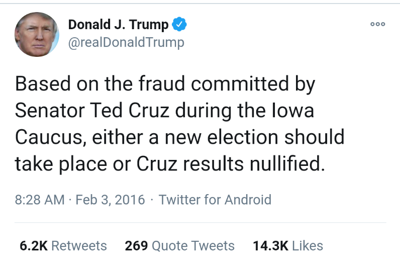Because the same candidate alleged the same thing in the 2016 Iowa primary and before the 2016 general.