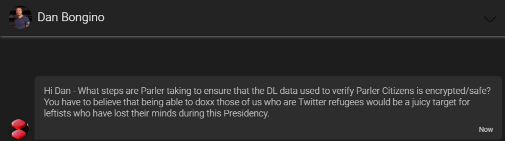 I understand that, thanks. I am so sick of having to be anonymous on twitter and still getting shadow banned. I was looking forward to being free and me even if my parler acct was not me outright but verified.
