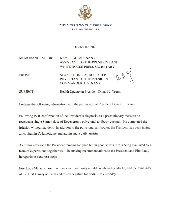 re: POTUS tested positive for CV. Sunday Afternoon Update: POTUS appreciates all the support.