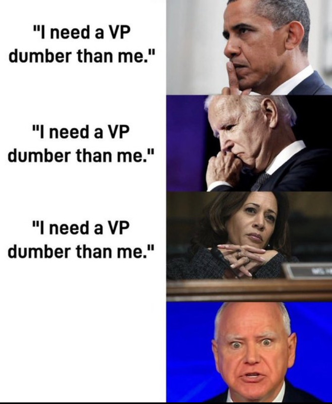 SHE wasn't about to pick someone that would come across as smarter, or funnier, or more qualified, or more minority-labeled, or more human than her. Because of that, the bar is set ultra-low. That means we get Man's-man-manly-man Walz.
