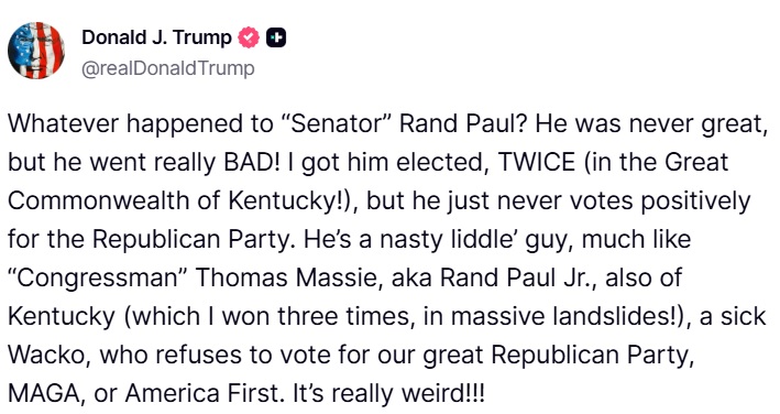 As usual, Rand will vote contrarian because he has nothing on the line. He gets to vote as a "principled," do nothing holier than thou grandstander that gets to pat himself on the back and put out social media posts to his voters, sucking his own dick over how great and principled he is. So he get's to be a principled "no" vote this time, when his vote won't matter... then comes along a bigger bill where his vote is needed and he'll vote with Democrats because he is a TDS RINO pussy. F that nerd.