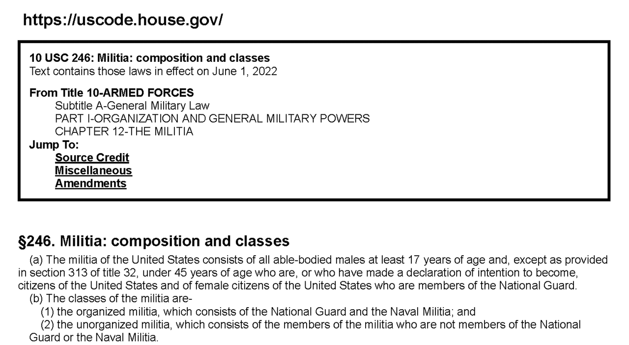 quote:Respectfully disagree. It is an acknowledgement in US code that all responsible citizens are to participate in the common defense. And sorry, but that was the original understanding of the Founding Fathers. It has been perverted over the years to transfer power to a central government (whether at the federal, state or local level) that they are responsible for our defense. And that is not true. We the people are.