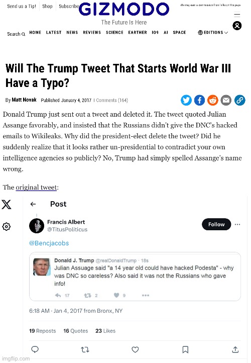 Yeah I remember fake news and libtards try to claim trump tweets going to start ww3.