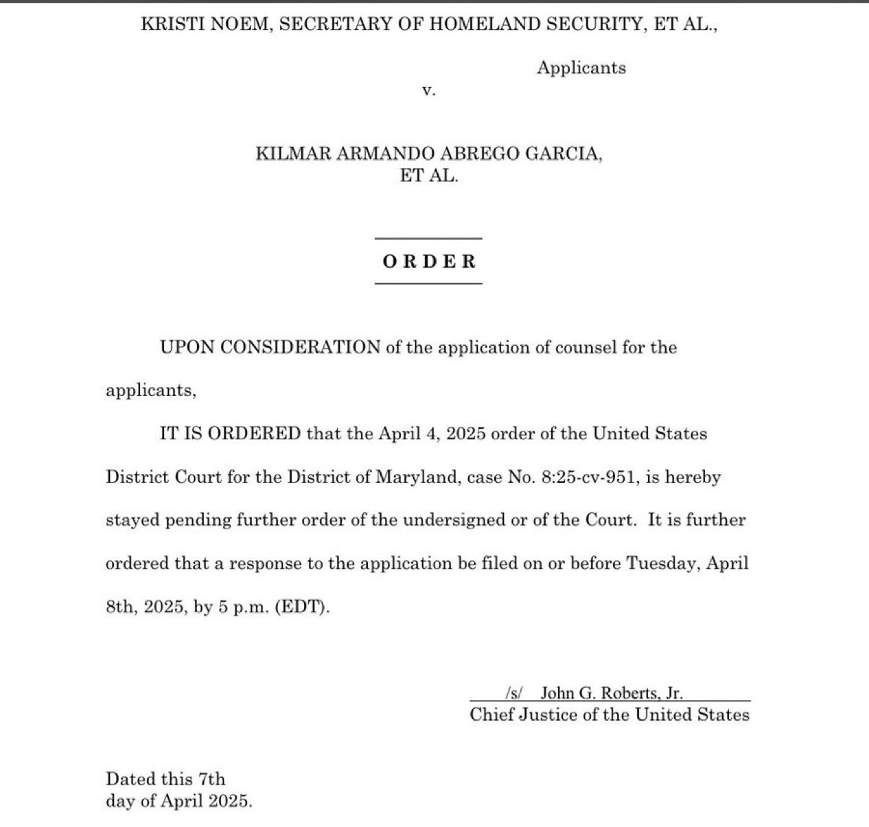 “The Executive branch may not seize individuals from the streets, deposit them in foreign prisons in violation of court orders, and then invoke the separation of powers to insulate its unlawful actions from judicial scrutiny,” Abrego Garcia’s lawyers wrote in a response filed moments after Roberts issued his temporary pause.