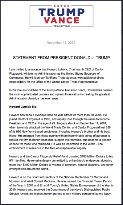 Possibility that Howard Lutnik gets names to Sec of Cmmerce today. I know Elon was pushing for him