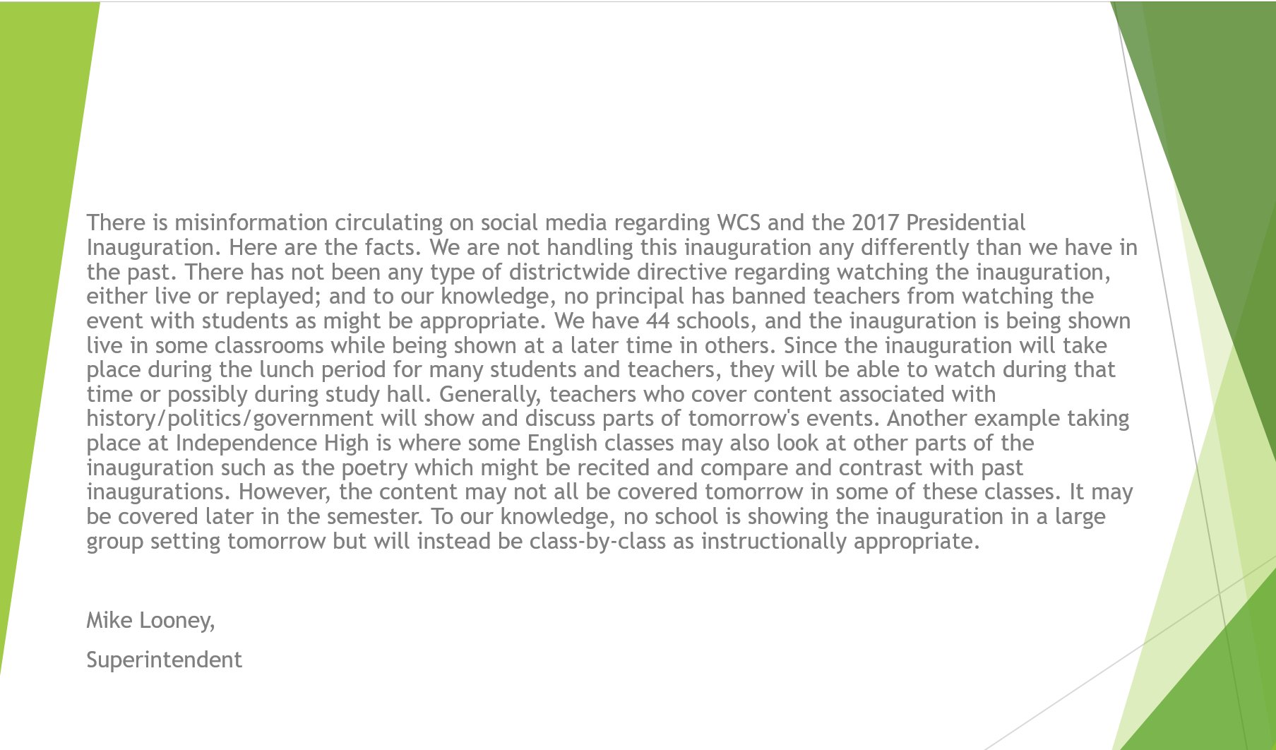 School ban of inauguration apparently false. Shows hypocrisy with media outrage.