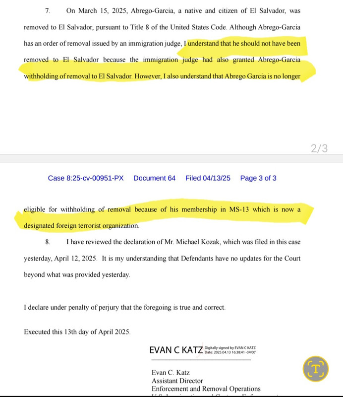 It's worth noting that the government has filed into the record the assertion that Abrego Garcia’s designation as being a member of a foreign terrorist organization bypasses the obligation to remove the withholding order. I found this affidavit filed on 4/13/25.