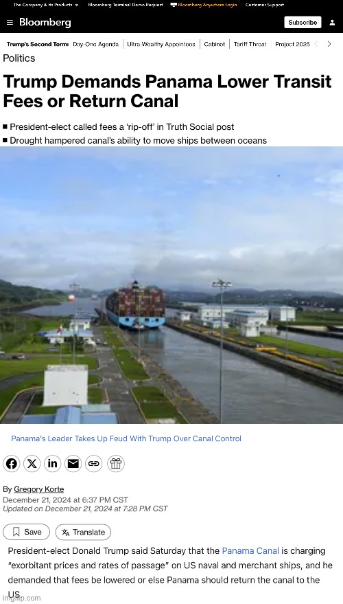 Now he is talking about wanting to go to war and reclaim the Panama Canal. Again, the only people that will win over this is big business, that he claims is being overcharged for its use. The Panama Canal gives people a shortcut to both Pacific and Atlantic Oceans. Why would America need to use the Panama Canal? America already has access to both oceans. It kinda looks like he is doing the bidding of a foreign government.