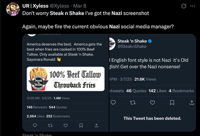 Most controversially, Steak ‘n Shake’s original X post about the new “Throwback Fries” on March 5 featured an “Old English”-style typographical font, which social media users were quick to compare to the infamous Fraktur font that was used in German Nazi propaganda.