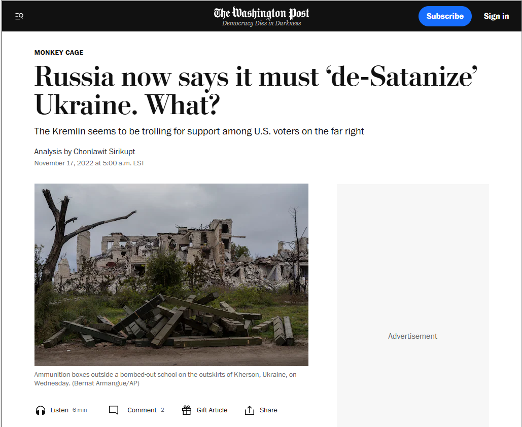 Nine months ago, Russia claimed its invasion of Ukraine was necessary to drive out the Ukrainian neo-Nazis allegedly in control of Kyiv. Now the Kremlin has switched tactics. Russian officials in late October reframed the goal of the war as a mission to bring about a “complete de-Satanization” of Ukraine. Alexei Pavlov, assistant to Nikolai Patrushev — a close ally of Russian President Vladimir Putin and secretary of the Russian Security Council — also accused U.S. leaders of backing the spread of satanic churches in Ukraine.
