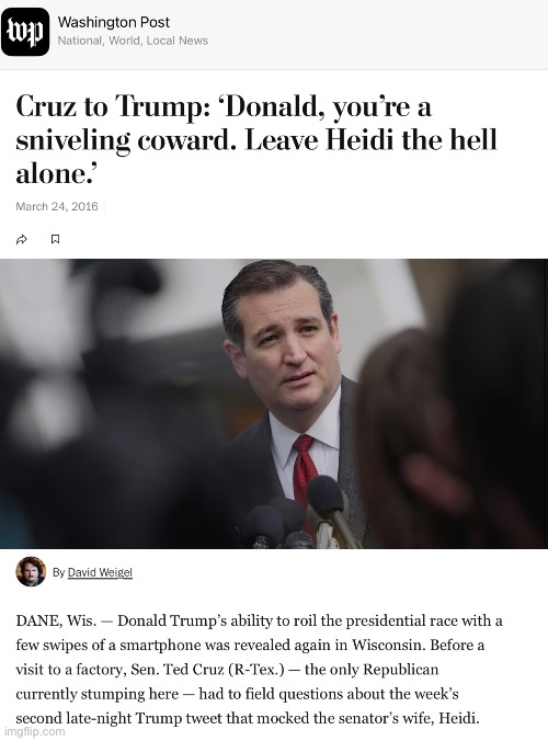 Trump was correct in targeting Heidi Cruz on the campaign trail in 2016. She and Ted are both born and bred Swamp Creatures. Don’t trust slimy Ted farther than you could throw him…