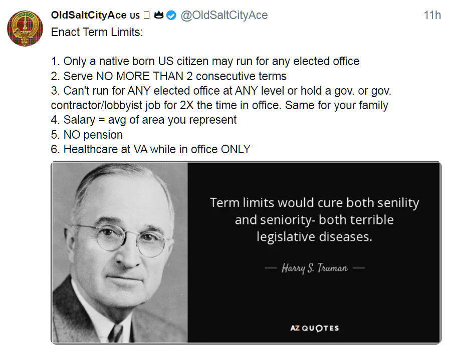 If you mandate two terms only for instance then you keep the best ones like Massie from staying around protecting our future.