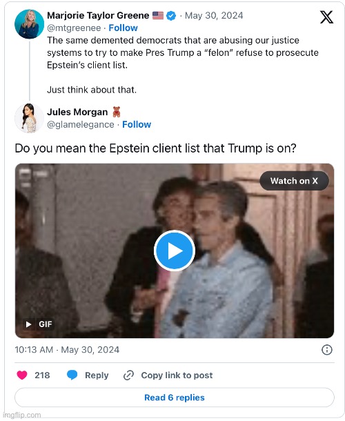 MTG indeed took tremendous heat in the MSM for suggesting that it is Epstein’s clients — and not Trump — that should be facing prosecution: