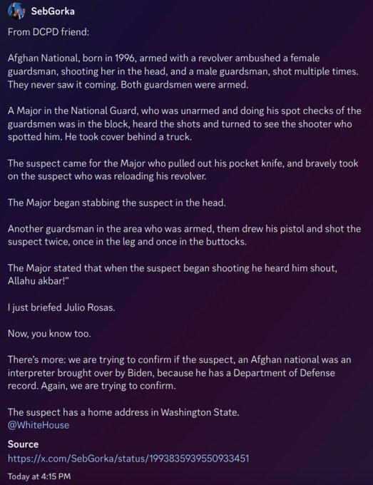 re: The shooter was Rahmanullah Lakanwal, an Afghan national (arrived in 2021)