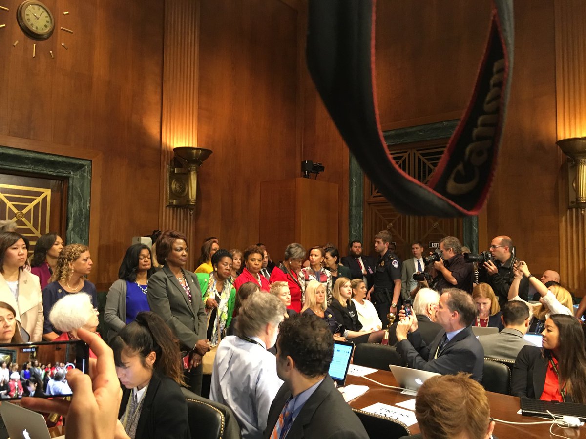 House Democratic women now standing at rear of Judiciary Cmte room in silent protest against Kavanaugh. Now filing out of the room