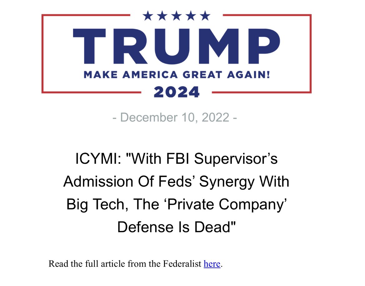 We now have concrete examples of the FBI sending over reports about individual tweets, after which Twitter staff apply warning labels and other actions. This is direct evidence that federal law enforcement is in the business of identifying speech for regulation