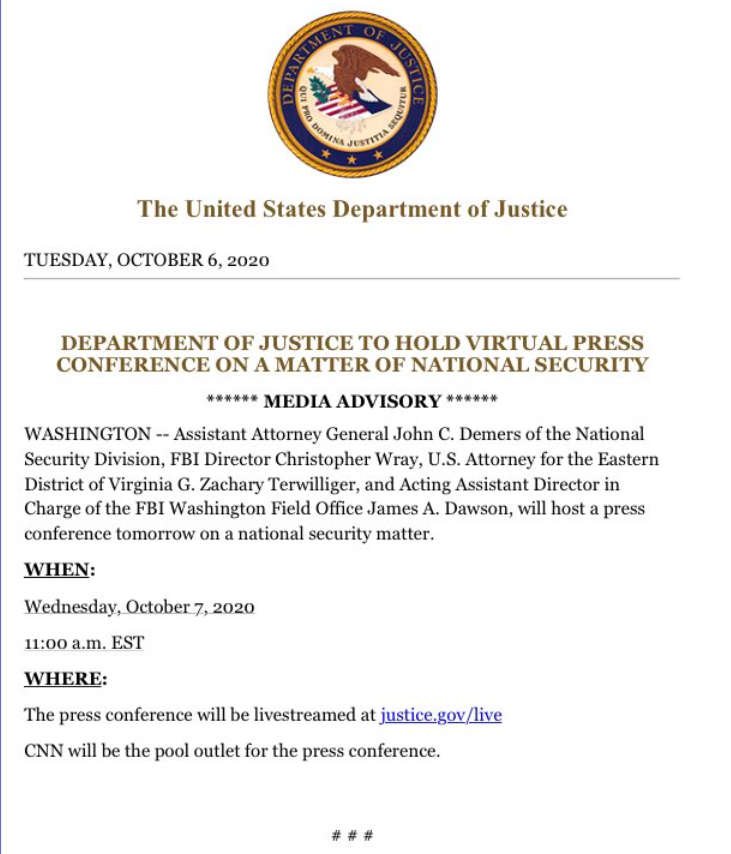 Twitter thinks it's going to be a press conference about election security/interference because Wray released this video today: