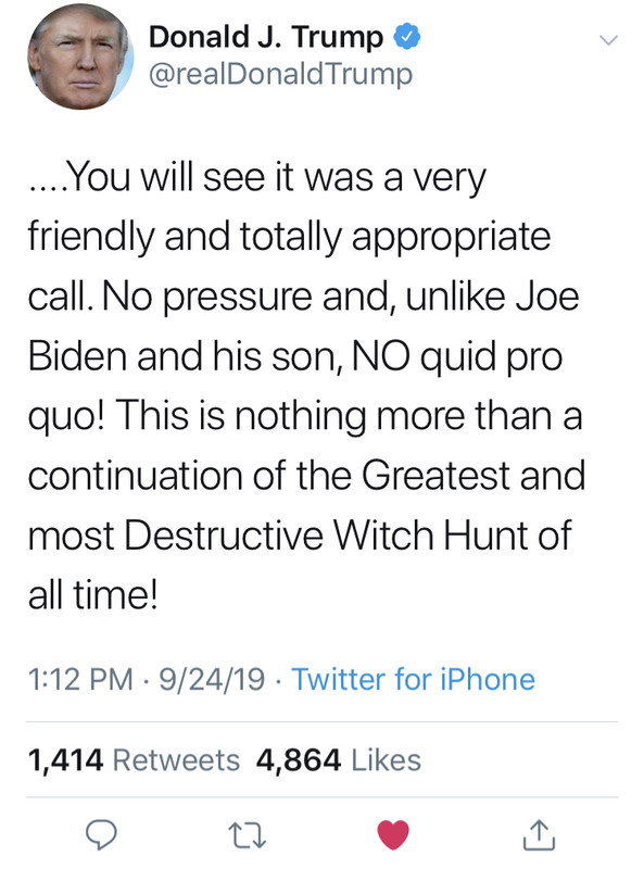 ....You will see it was a very friendly and totally appropriate call. No pressure and, unlike Joe Biden and his son, NO quid pro quo! This is nothing more than a continuation of the Greatest and most Destructive Witch Hunt of all time!