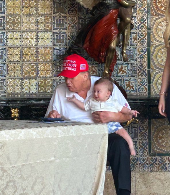 Trump hitting send & enjoying the melts while holding the munchkin