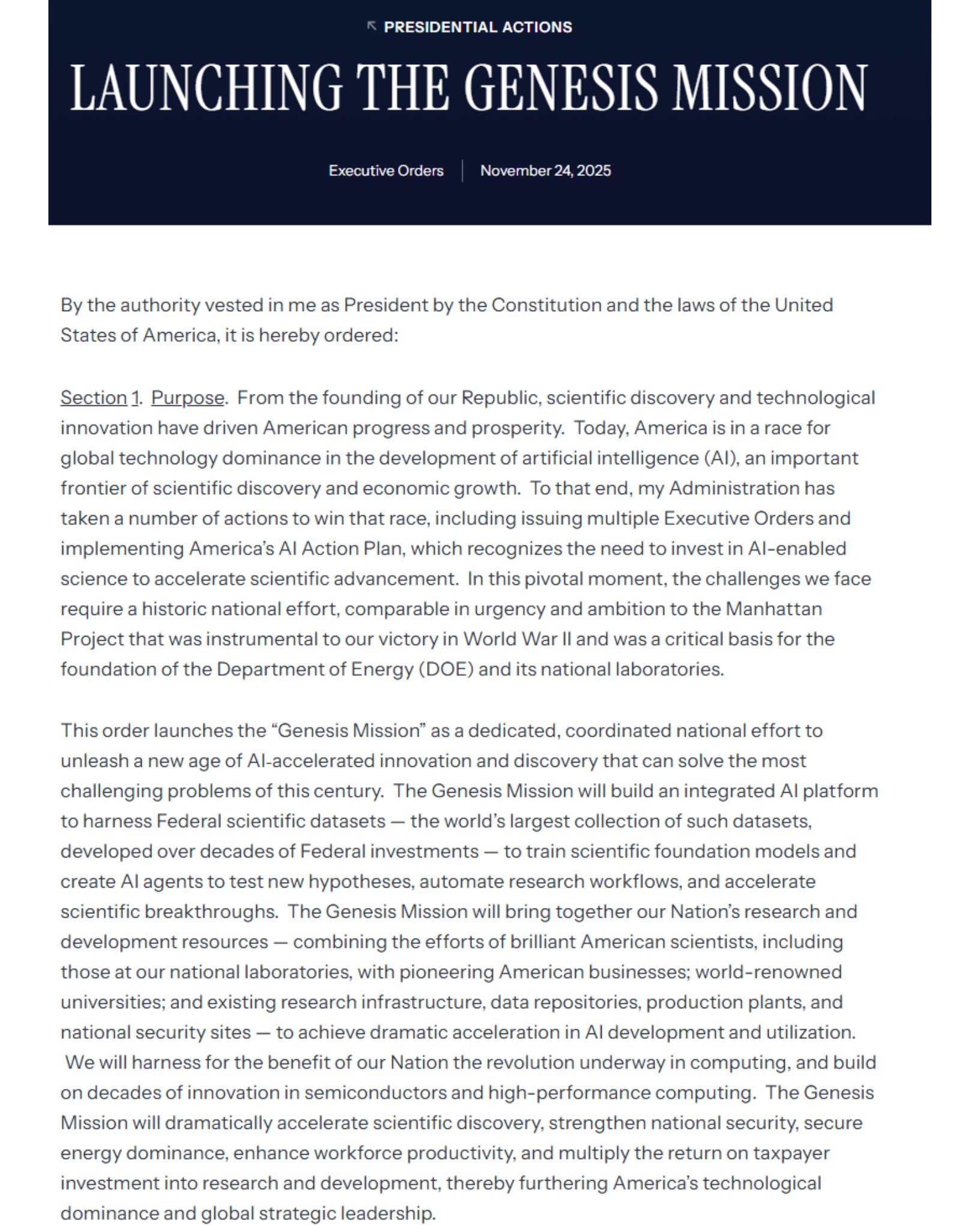 "The Genesis Mission will bring together our Nation’s research and development resources — combining the efforts of brilliant American scientists, including those at our national laboratories, with pioneering American businesses; world-renowned universities; and existing research infrastructure, data repositories, production plants, and national security sites — to achieve dramatic acceleration in AI development and utilization."