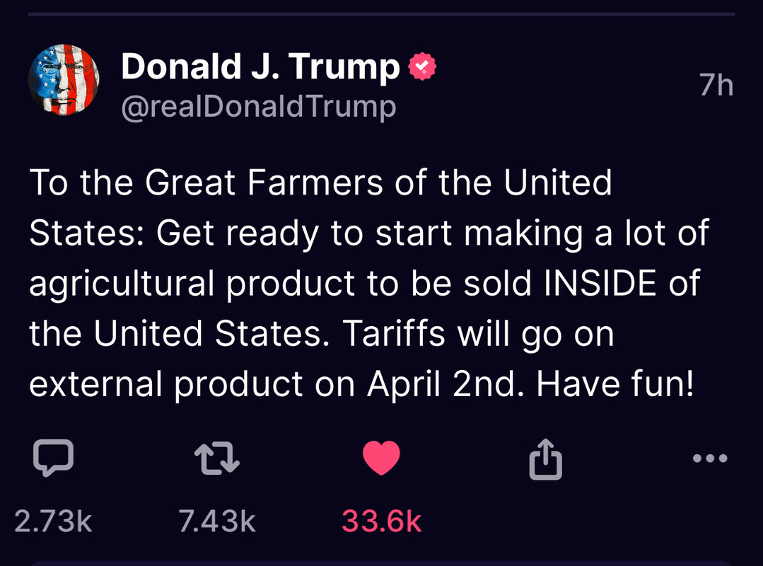 This is actually great news. Farmers don't make shite shipping things around the world. It's too expensive. Since incoming farm products will be tariffed, then that makes the demand in America much greater for the farmers which they will make a shitload more money