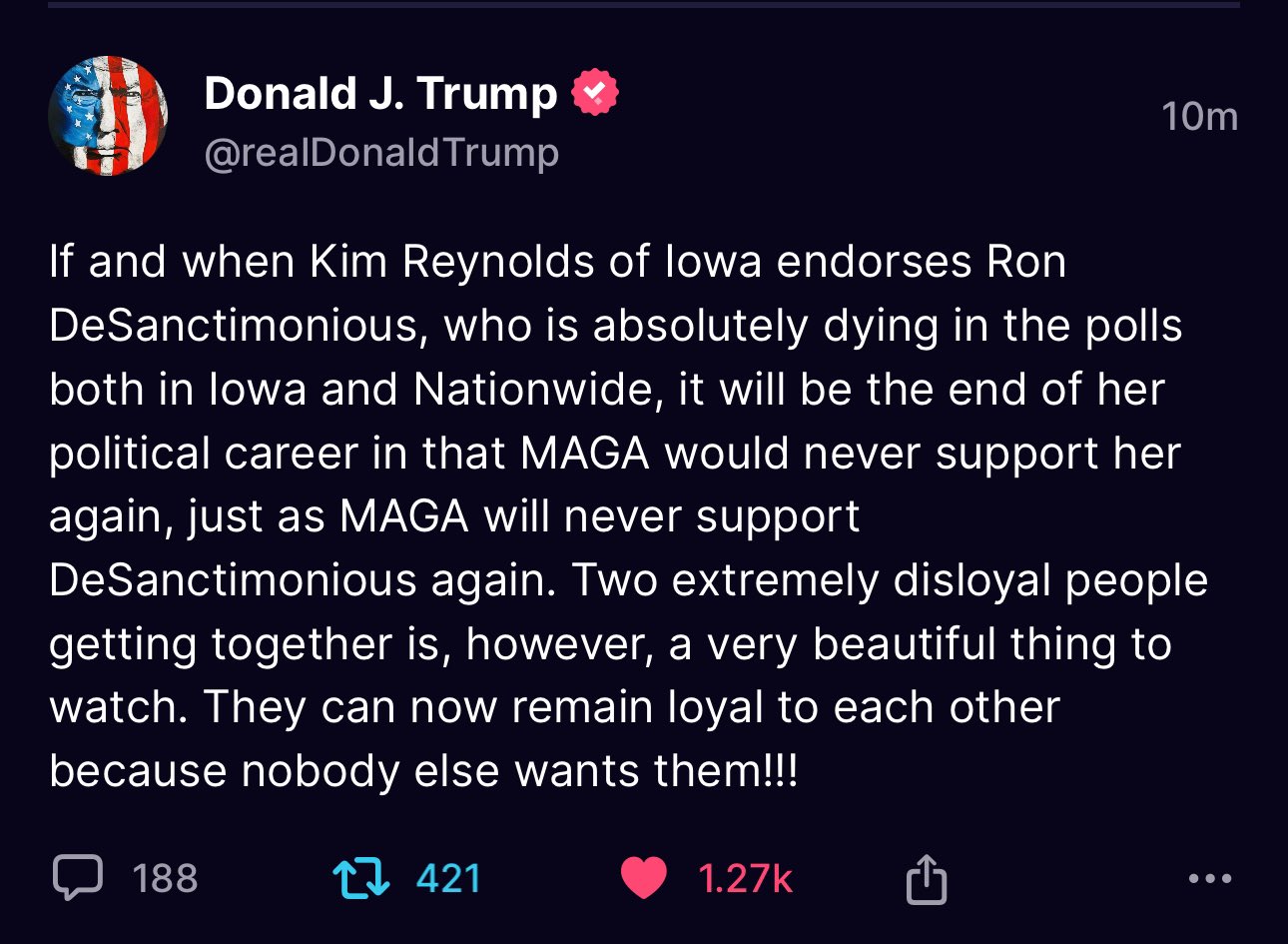 quote:So does Trump. Cult 45 is cheering on the destruction of one the most successful and conservative governors in the country straight up using democrat talking points.