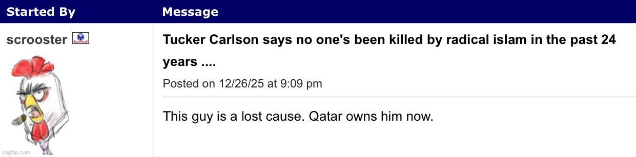 Tucker has lost his shite. Moved to Qatar and thinks the CIA is trying to probe him. Has cozied up to the Muzzies lately as they share a common ideology in hating Israel and the US government. It won’t be long before he is hosting a podcast in Nigeria explaining we have no business blowing up ISIS goat farms and he literally hasn’t met one dead Christian yet.