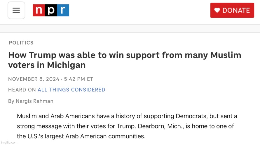 He won a larger percentage of Muslim votes because they boycotted the dems due to Biden admin’s support of Israel. A lot of Muslims (D) votes stayed home thus creating an illusion with the percentages.