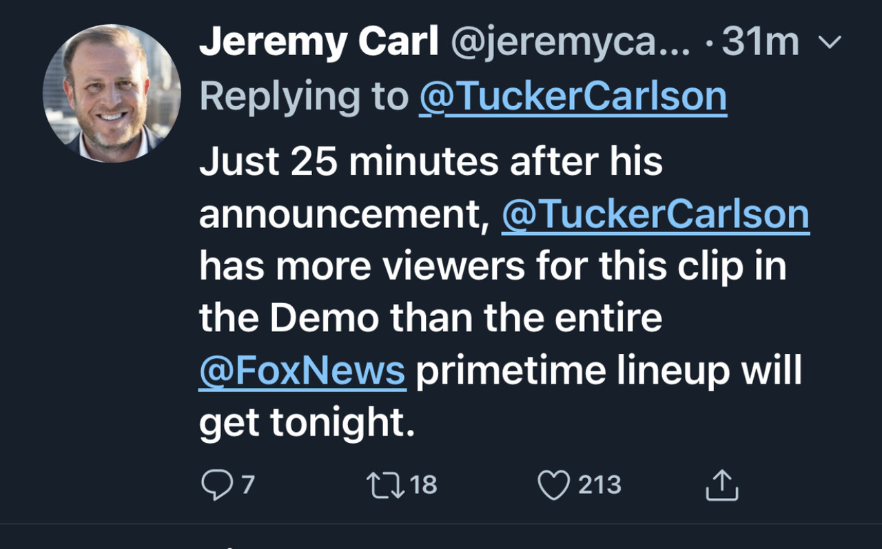 Tucker just announced that he will host his new show exclusively on Twitter in the near future