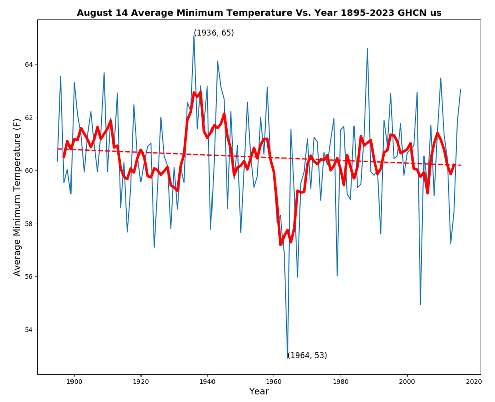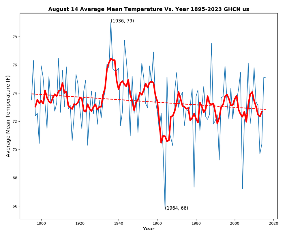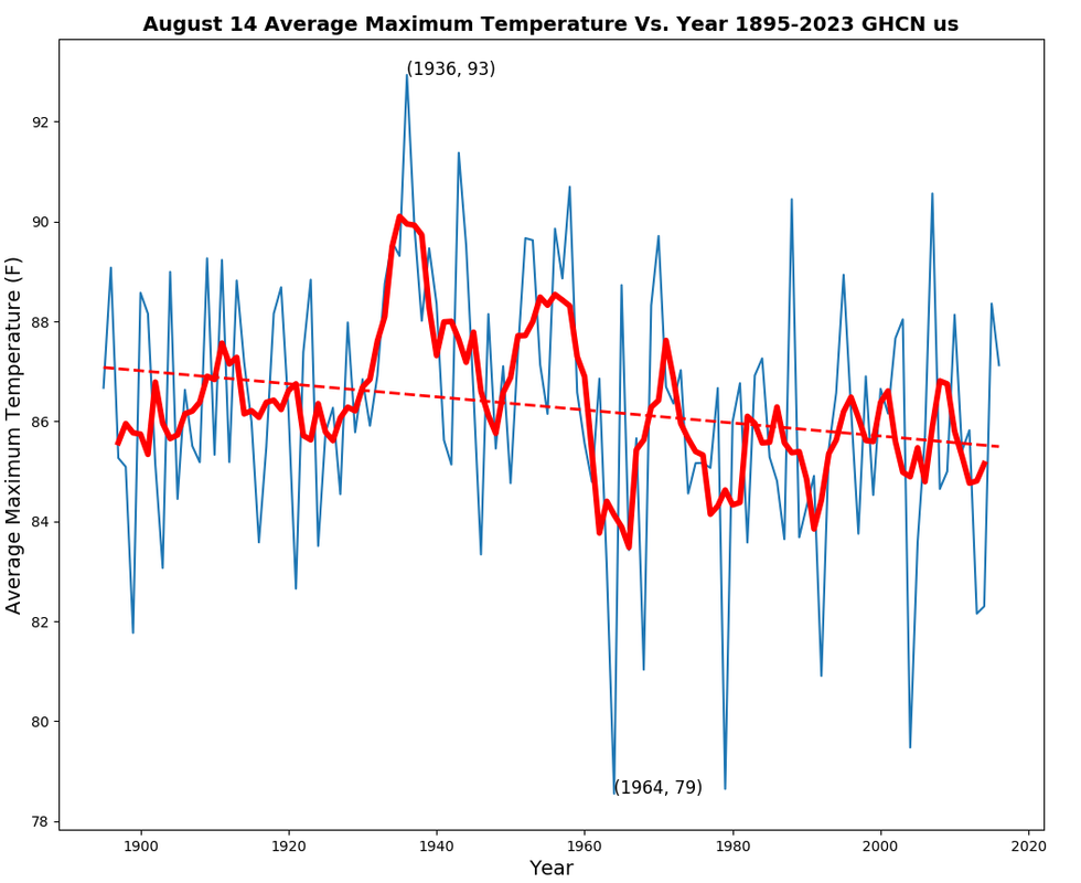 Tony Heller over at realclimatescience.com has provided open source python script that accesses NOAA raw temperature data. This is the raw temperature data that climate scientists start with. If you plot the raw temperature data from the time they started gathering the temperature data (circa 1895) the US temperature data clearly shows a downward trend over time. Here are some output charts: