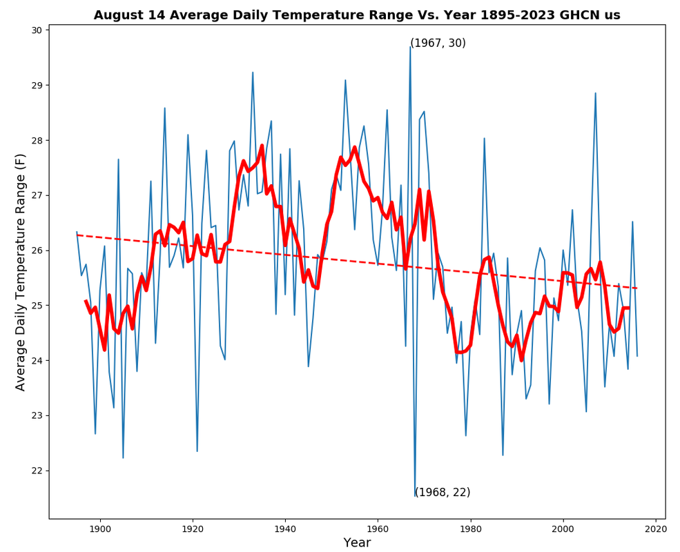 Note from the last graph over time we are seeing a tighter range between daily highs and lows. This temperature behavior is becoming more temperate. This is expected with a greening earth. There is a direct correlation with CO2 and earthly greening. Plants love CO2. With more CO2 we have more photosynthesis which leads to more atmospheric water vapor. Water is the biggest energy capacitor in our atmosphere. With more atmospheric heat capacity you would expect to see a more temperate data set. That is exactly what we see in the raw NOAA temperature data.