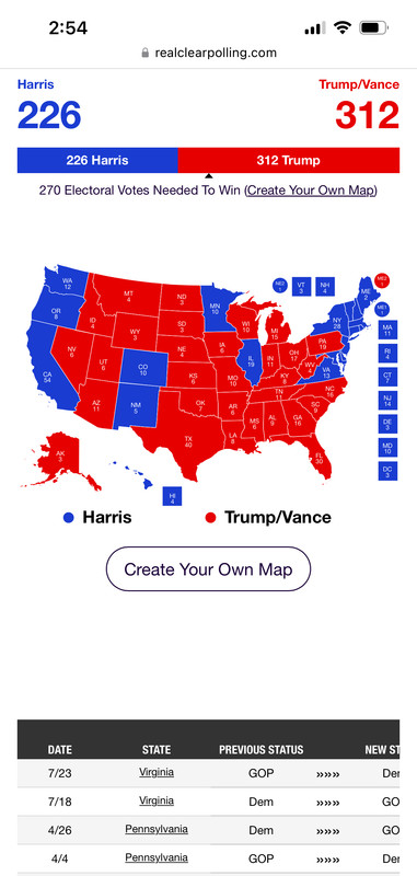 Just for fun, the betters poll Poly Markets has Trump with enough Red or leans Red to win with only Pa and Mich to close to call. This can change but