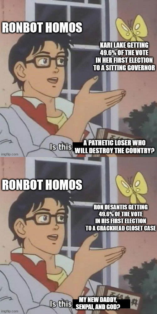 Ten bucks says the down-voter is furiously Googling to see if Kari Lake and DeSanctus really got the same percentage of their respective votes in their first go-rounds.