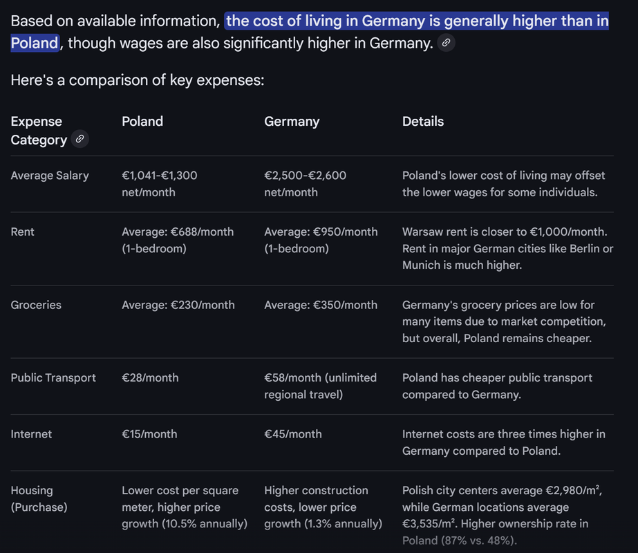 I have several Polish tenants living and working in Germany. Cost of living is about the same as Germany ,yet in Poland the income is about half.