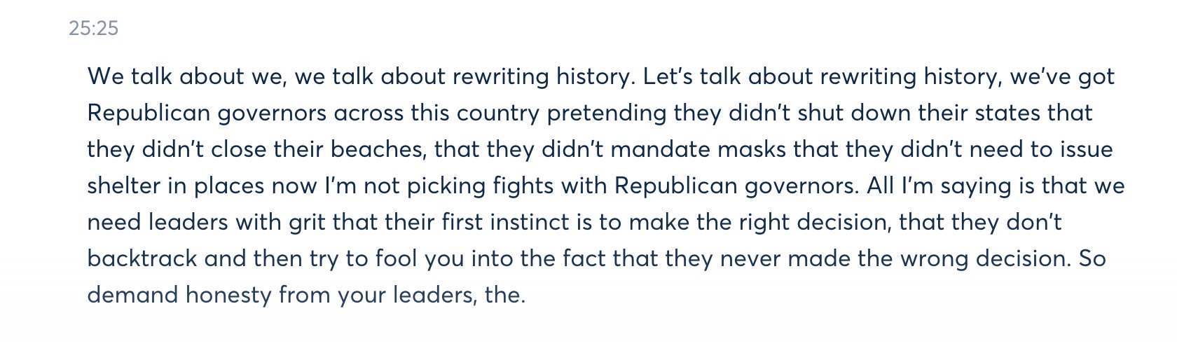 "Let's talk about rewriting history. We've got Republican governors across this country pretending they didn't shut down their states, that they didn't close their beaches...."