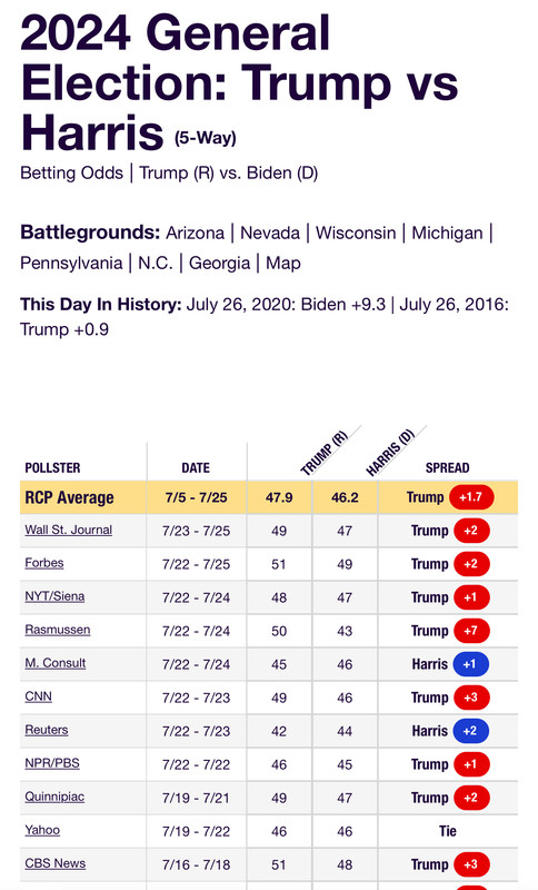 National polls mean shite. Just like if you polled who would win in Alabama. Trump would be up 80%. National polls are something the media pulls out. to sway votes . Republicans will never win the popular vote so if Trump is up 2 % in a national vote Harris will be replaced at the convention because that will be bigger than Reagan Mondell. And actually not even close to that.