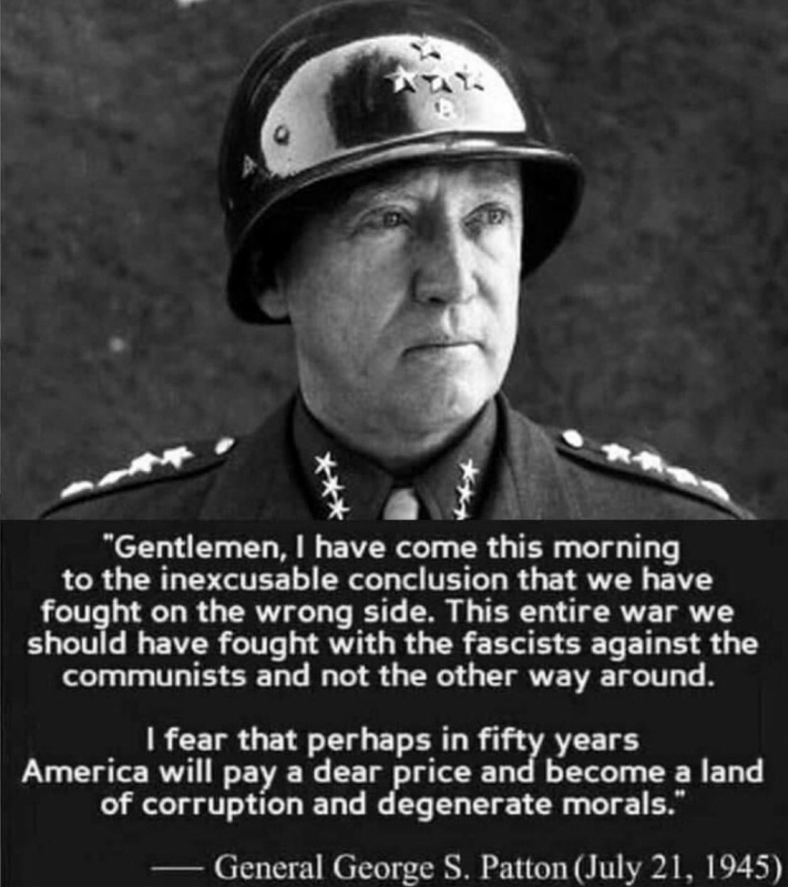 The added part about America becoming a "land of corruption and degenerate morals" in fifty years has no basis in Patton's documented statements and seems like a modern embellishment to tie it to contemporary cultural debates.