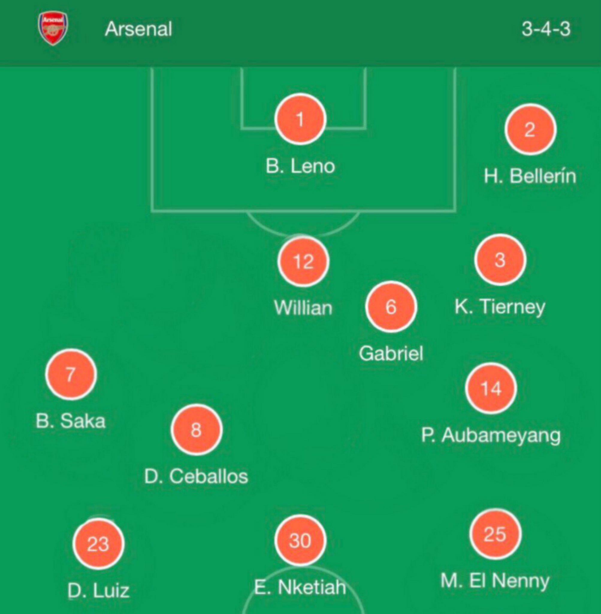 Leno, Bellerin, Luiz, Gabriel, Tierney, Ceballos, Elneny, Saka, Willian, Aubameyang, Nketiah