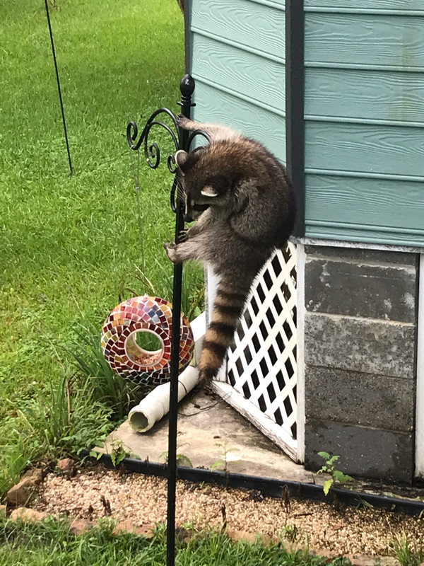 Inlaws called, had a raccoon hanging from a bird feeder. got wrapped up in a cable.