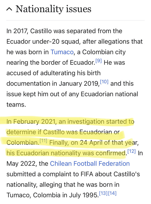 Chile claim to have proof that Castillo was born in Tumaco, Colombia in 1995, and not in the Ecuadorean city of General Villamil Playas in 1998 as stated on his documents.