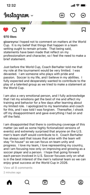 Kinda crazy to me that there are a hundred talking points coming from this story and none of them are aimed at Gio needing to sack up and not be a prick during the World Cup. And yes you can hate Gregg and think he handled the situation poorly while also acknowledging that Gio has a lot of growing to so if he wants to be a leader on this National team.