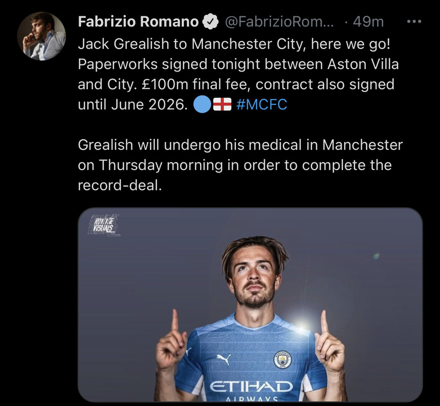 Jack Grealish to Manchester City, here we go! Paperworks signed tonight between Aston Villa and City. £100m final fee, contract also signed until June 2026. Blue circleFlag of England #MCFC
