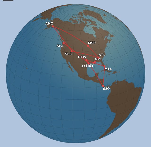 ETA: Ugh, not sure why Imgur link isn't working. Anyway, basically did a bunch of domestic routes + Toronto and a few spots in South America and Mexico.