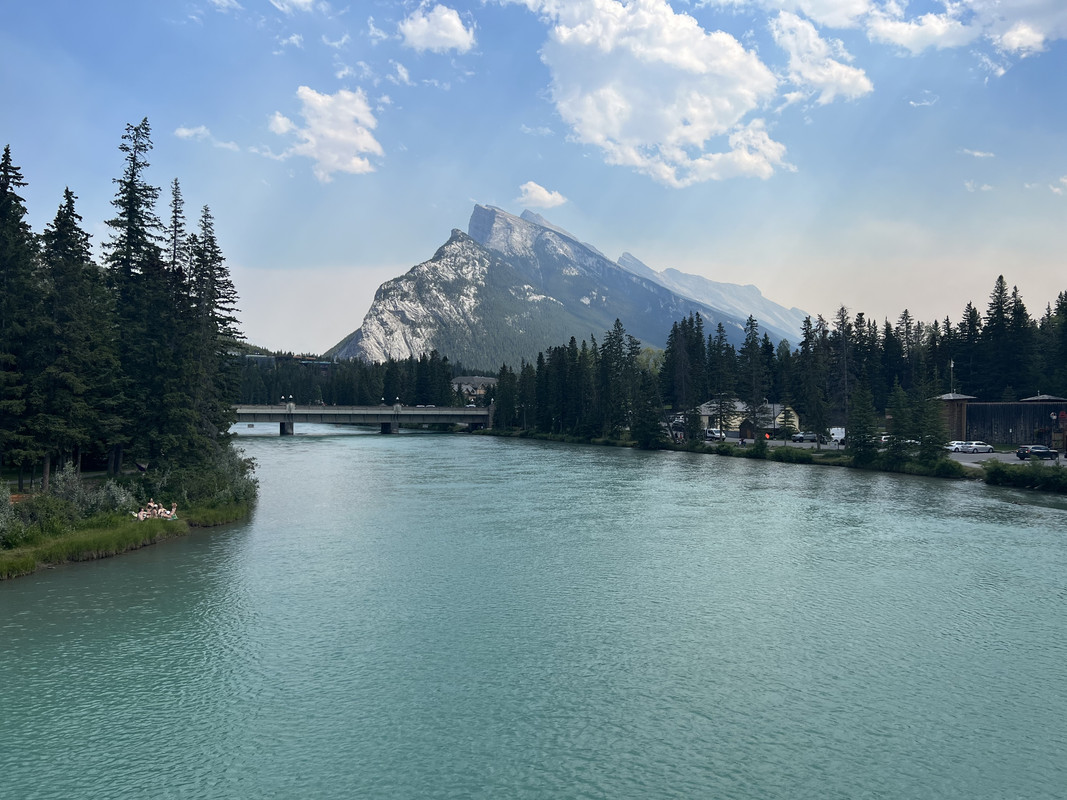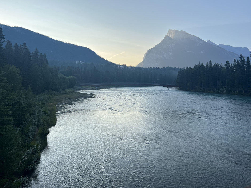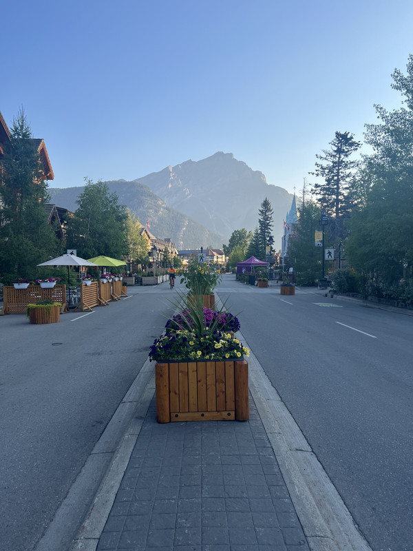 -6am coffee run at White Bark, walked around downtown, walked down to bridge at end of Banff Avenue and look back at the iconic Cascade Mountain