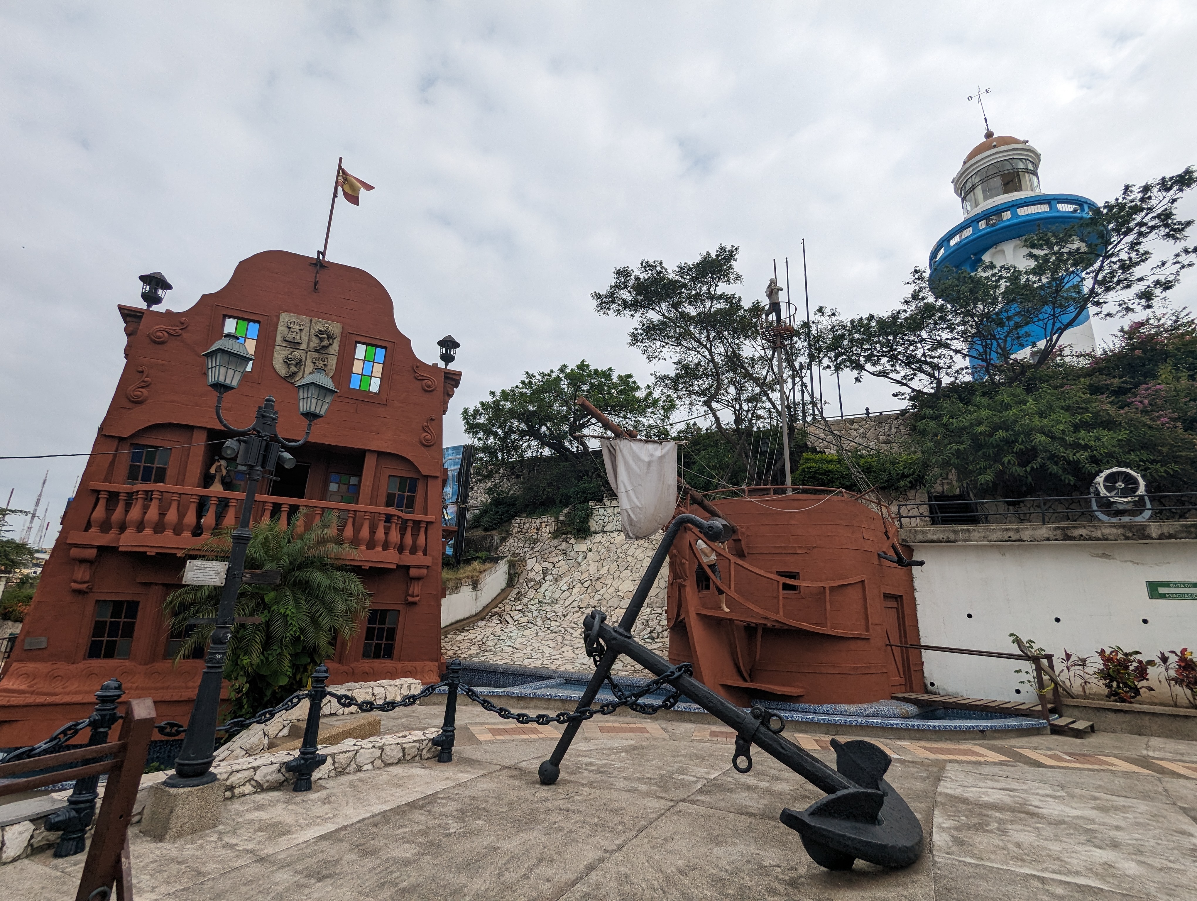 The hill in the distance is Las Penas, the oldest neighborhood in Guayaquil. The lighthouse at the top is my destination (many of the 444 steps up the hill are numbered, so you know how far you have to go).