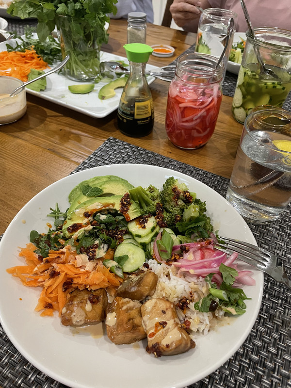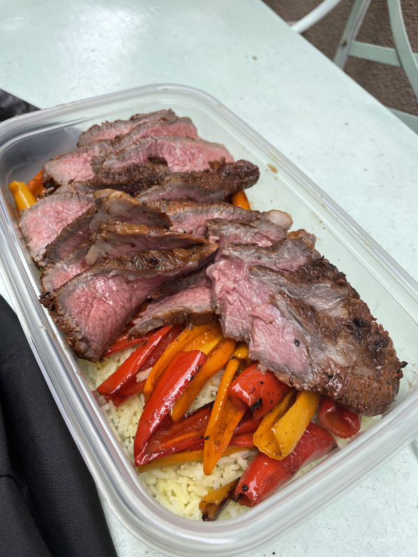 Meal prepped some saffron rice, grilled peppers, and Santa Maria style tri-tip with zhug.