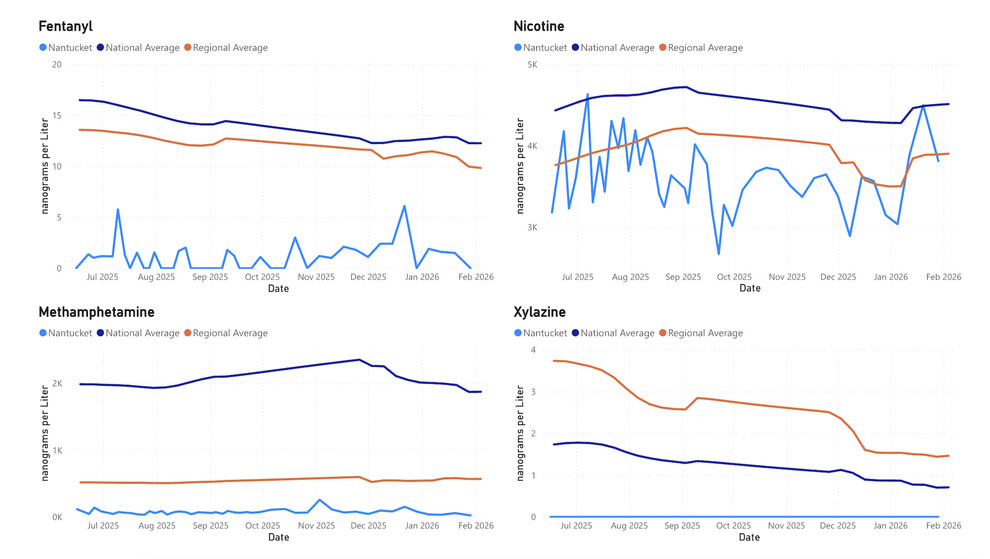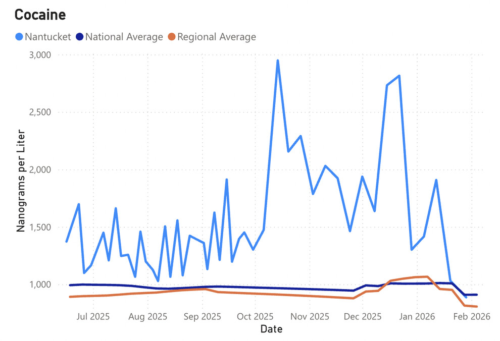 Eight months of wastewater surveillance data show consistently elevated levels of cocaine in Nantucket’s sewage - with spikes in October and December 2025 that were nearly three times the national average - even as island police have made numerous high-profile cocaine busts, including the largest in the department’s history.