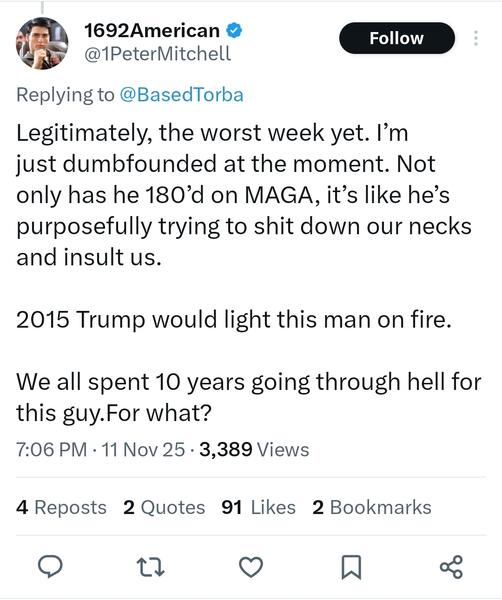 Its happening in this thread from over a dozen longtime supporters. Its happened several times in this first 10 months, in fact. Theres a literal revolt going on now - read the replies on Don Jr's X feed for example.